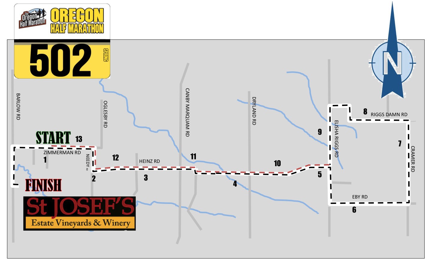 The half marathon started at 8 am. We were bussed to the start line about a mile from the finish at the winery. It was a nice location where we ran through the countryside by big farms and vineyards. At mile five we started the loop that would take us back the same way we came. Here’s the race route we took: