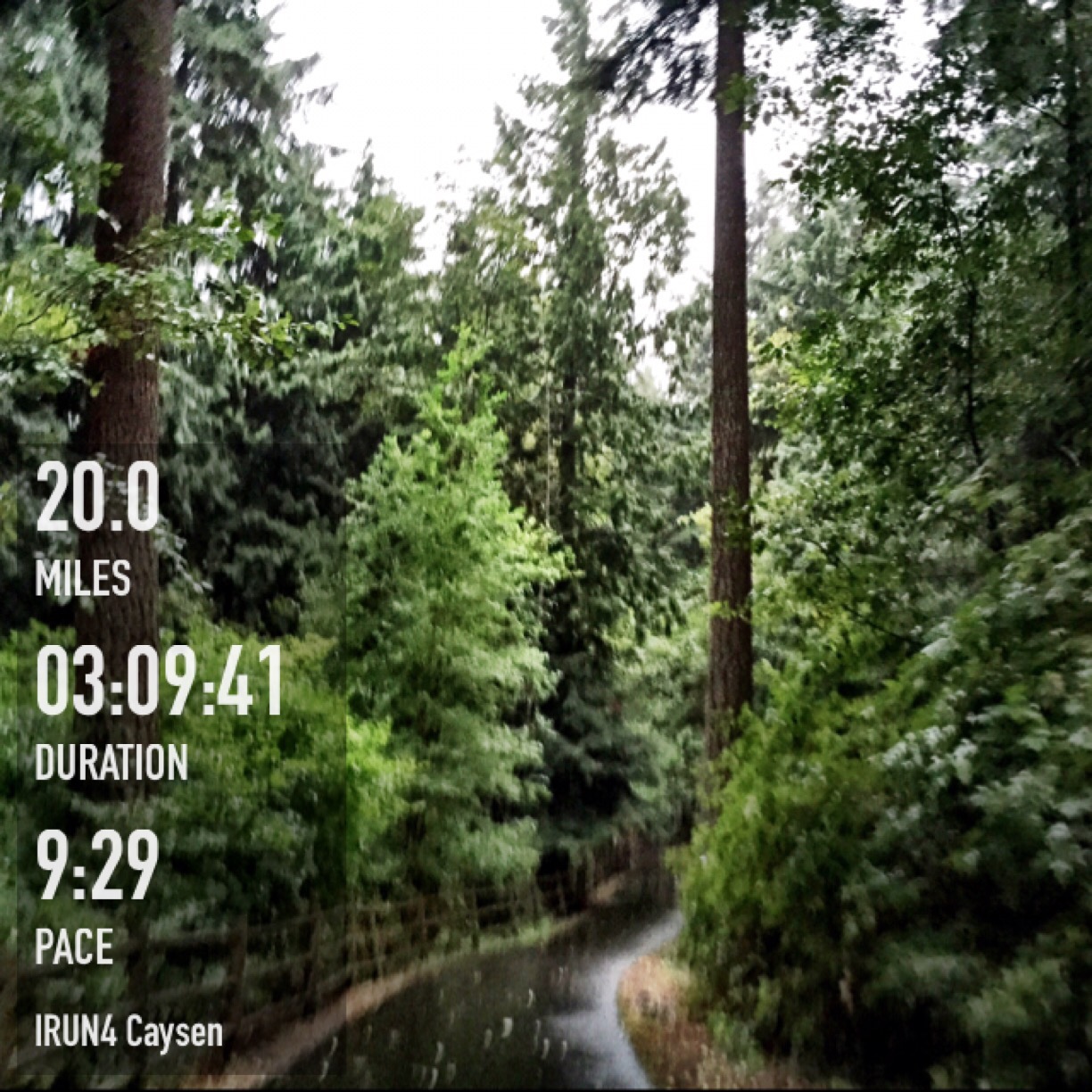 The 20 miles were tough especially since it was a hilly course and rained for a good portion of it. The rain wasn’t bad and felt good at times. But when I finished I had the thoughts of how I would get through 6.2 more miles at a faster pace. My main goal is to finish the marathon but another goal is to finish under 4 hours. I ran most of it at a more comfortable pace since the program says to run the long runs slow. But I also looked at what RunKeeper had planned for me and they had an 18 miler planned with 3 fast miles towards the end and the last 3 miles steady. I decided to incorporate that in my 20 miler to see how I’d do and I ran miles 16-18 faster with splits 8:53/8:42/8:55 and then miles 19, 20 back to a steady pace and got 9:45 and 9:19. I’m actually pretty happy with how I did. But to do another 6.2 miles has me nervous. For me to get a time of 3:59:00, my average pace needs to be 9:07 per mile. There’s still five weeks left and one more 20 miler scheduled. I’ll see how I feel in a couple of weeks. 🙂