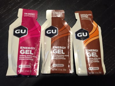 - Gels – I’ve been using Gu while training and bought a bunch when they were on sale for .99 at REI. When I did my 20 miler I took one about every 45 minutes and ended up using 3 gels. I could’ve taken another gel but didn’t have much further to run and felt fine.