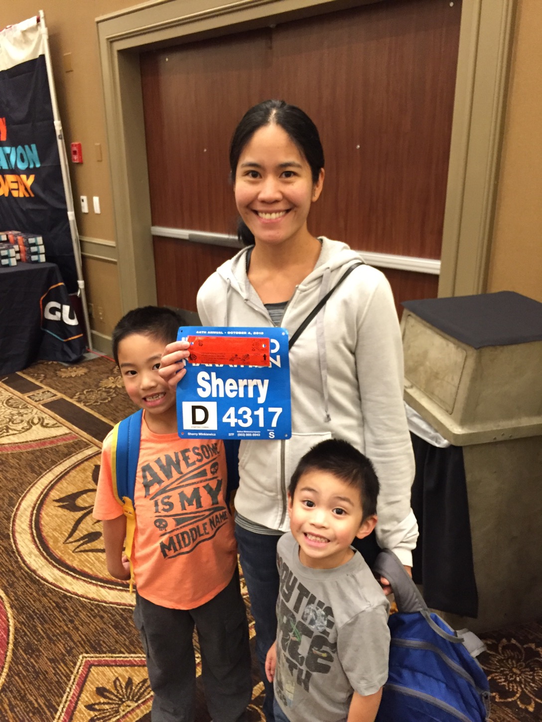 Let’s go back to Saturday morning. I woke up early and had to go to the bathroom right away, like really right away. Sorry for TMI but I had the squirts. I had a headache and my tummy hurt too. I think it was from the sushi I had the night before, or it was from what my kiddos had earlier in the week, but their symptoms were more puking. Either way, I felt horrible. I didn’t feel like doing anything really, but Saturday’s highlight was getting out to go to the expo to pick up my bib. I went with the kiddos and we were pretty much in and out. Here’s a pic from the Expo: