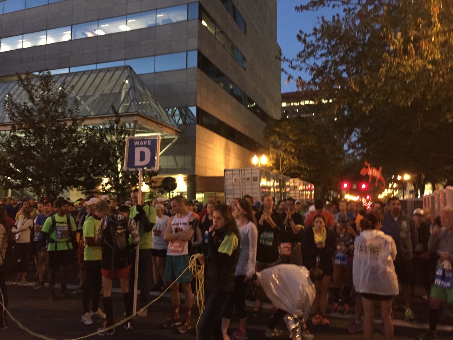 The race started at 7 am and we got to my corral around 6:35 am. It was cold with the wind. My Garmin said it was 50F with 87% humidity. It was actually great running weather. The waiting part is when it’s cold. Below is a pic of corral or wave D.