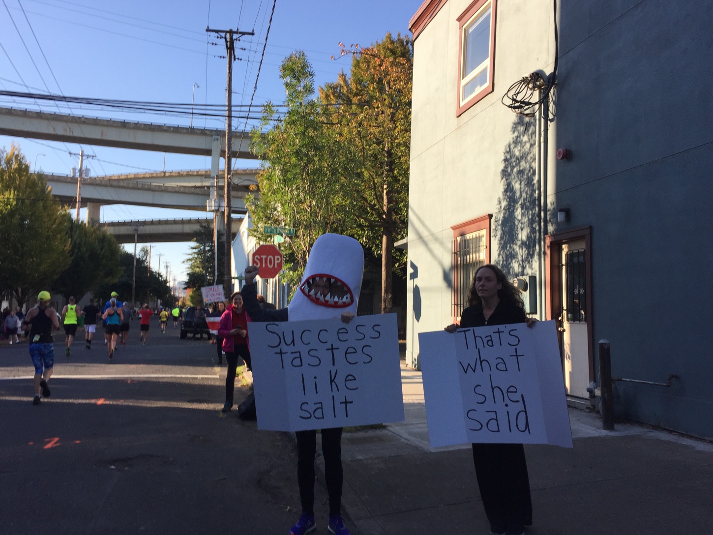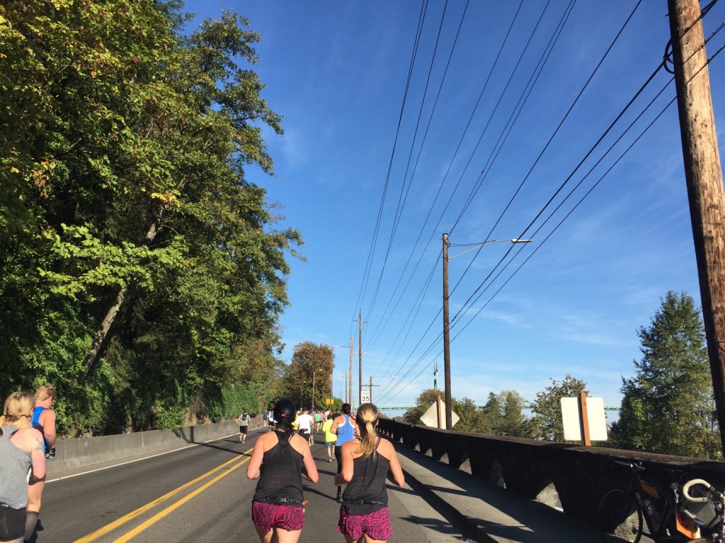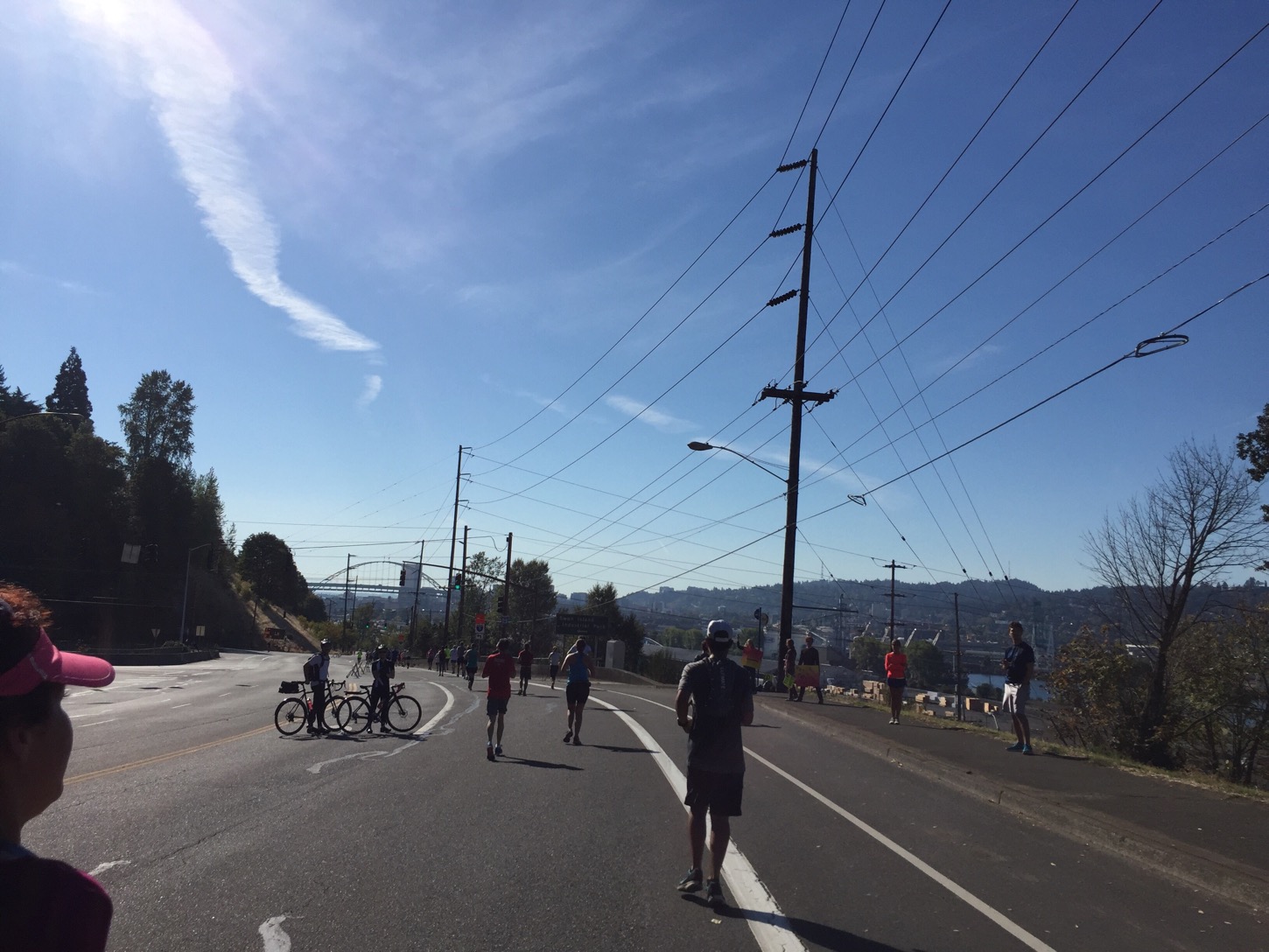 Gotta love the signs and people who dress up!So I felt pretty good for the first half but after that around mile 15ish I just wasn’t feeling it. My pace slowed. The gradual climb towards the bridge was getting to me. I was thirsty. I should’ve used two Simple Hydration Bottles like during one of my 20 milers. But I thought with all the aid stations I would be fine. I should’ve know better. Oh wells. Then I was thinking this is my first marathon and knowing what I went through the day before, I decided to walk the difficult hill right before St. John’s Bridge. I walked the whole thing lol.