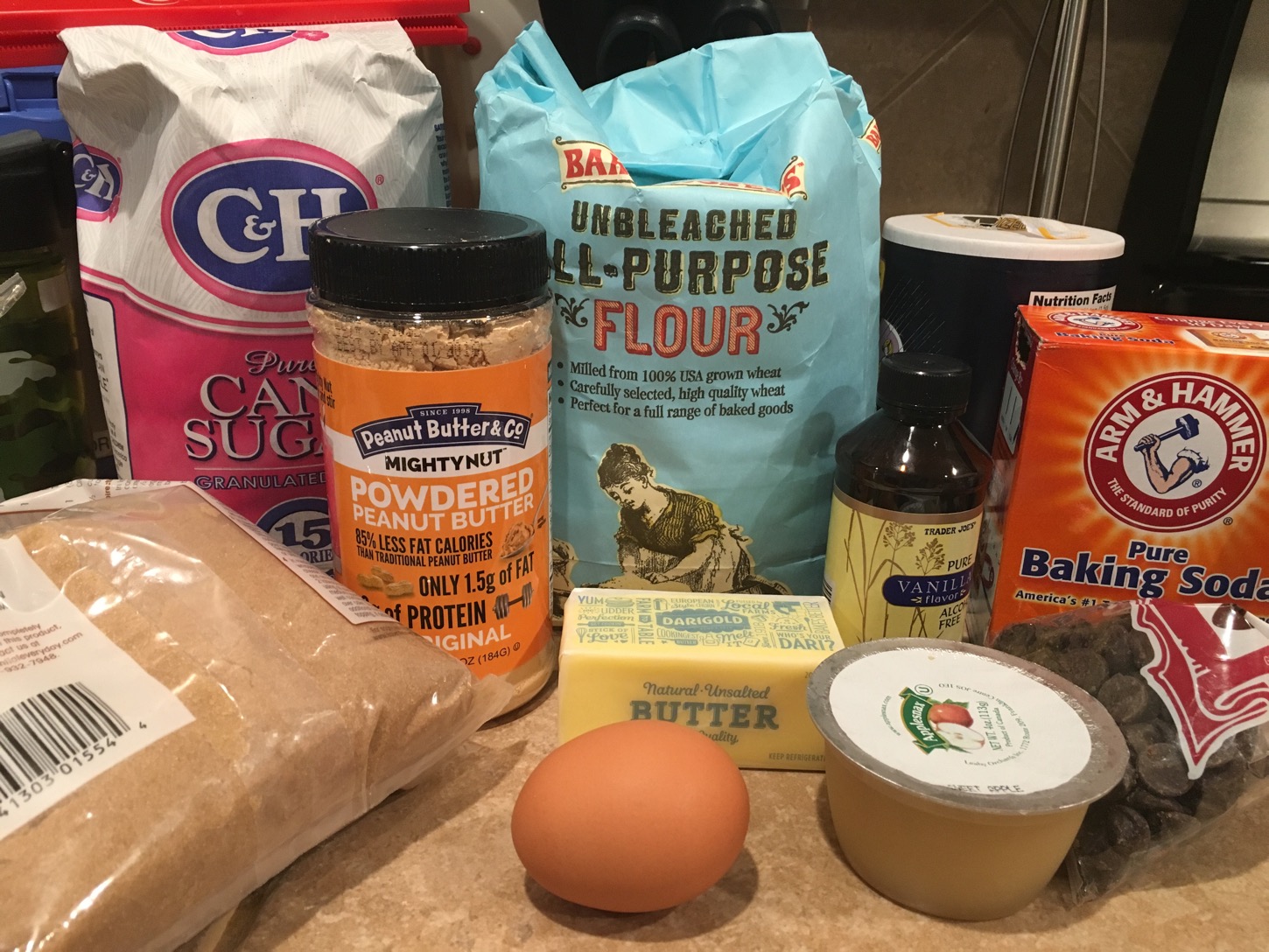 It’s been a little while since I baked and I thought it would be the perfect time to use the Mighty Nut Powdered Peanut Butter to bake cookies. I decided to pull out an old chocolate chip cookies recipe I used a lot when I was younger from my home economics class that I tweaked and made into a peanut butter chocolate chips recipe. Instead of shortening I used applesauce. I also reduced the amount of chocolate chips as well as added the peanut butter. Here’s the recipe: