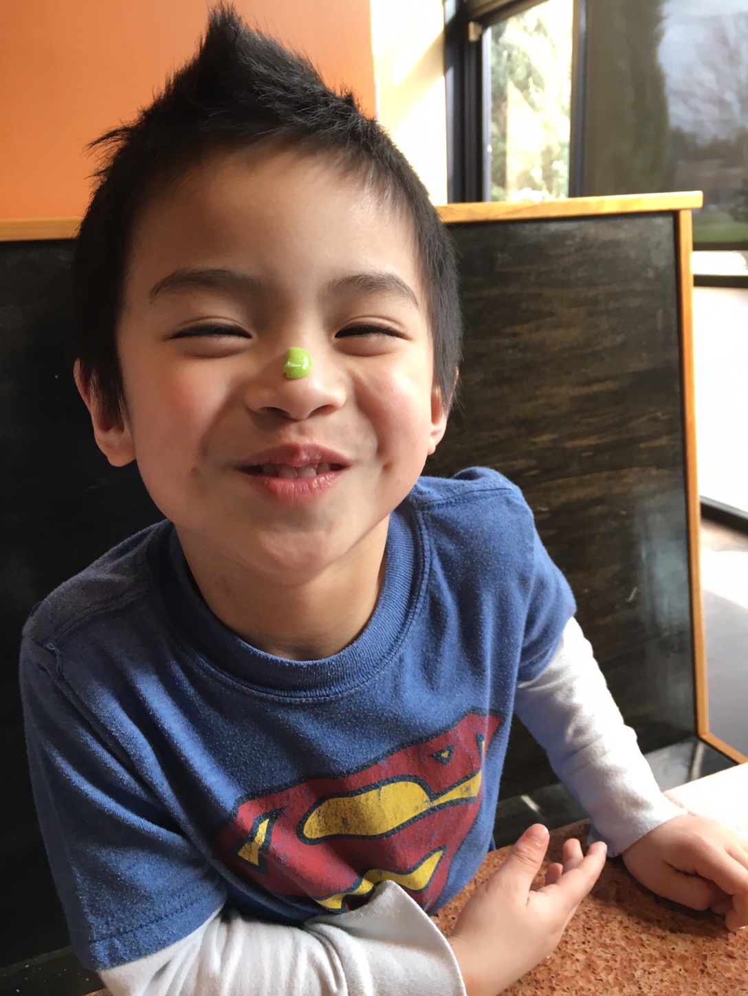 Here’s my 5 year old being silly with a piece of edamame on his nose lol.