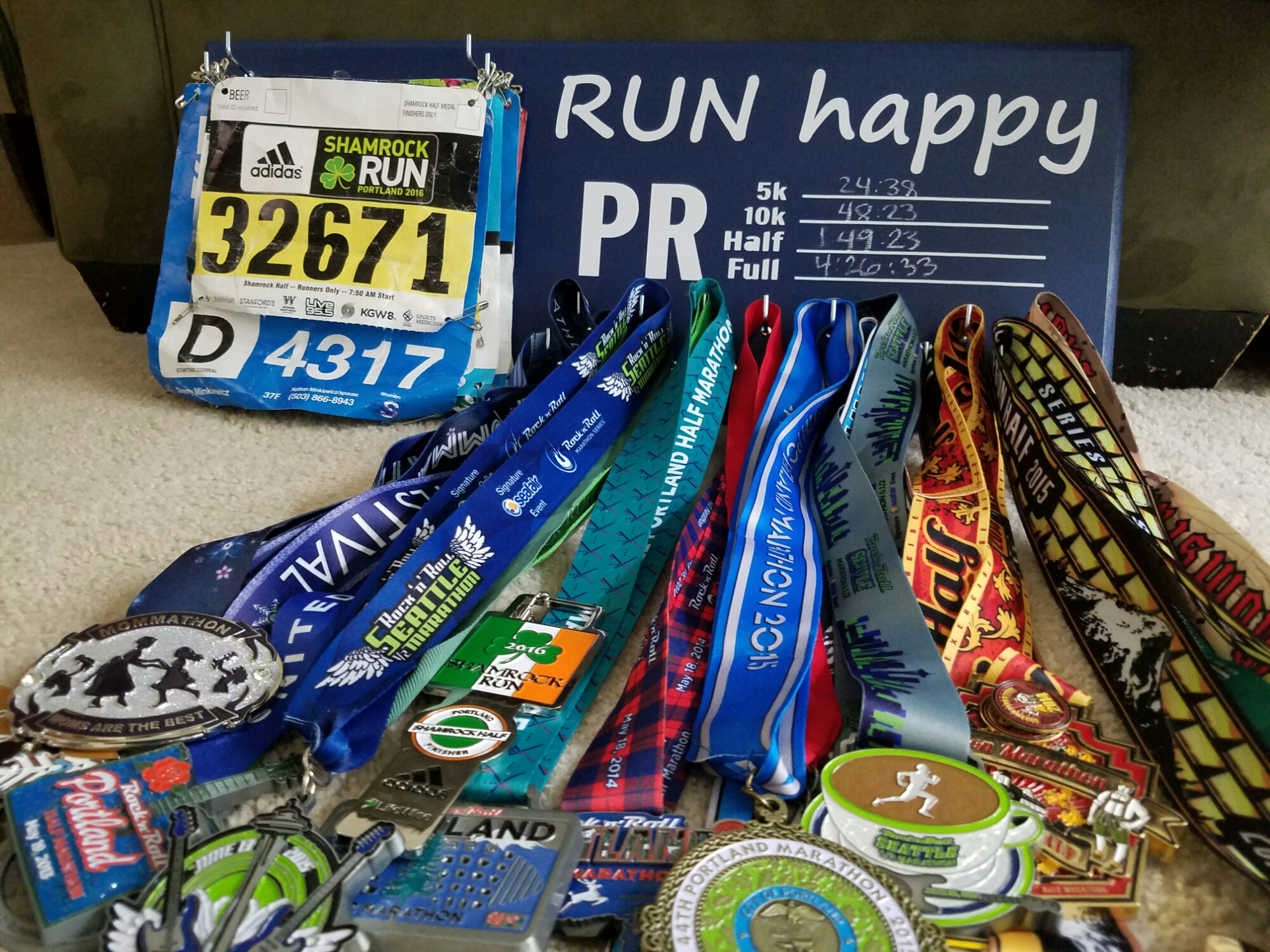 The nice folks at Running On the Wall sent me an extra medal and bib holder. I’ve decided to do a giveaway. One lucky reader will win the Keep Running medal and bib holder with PRs displayed below. 🙂